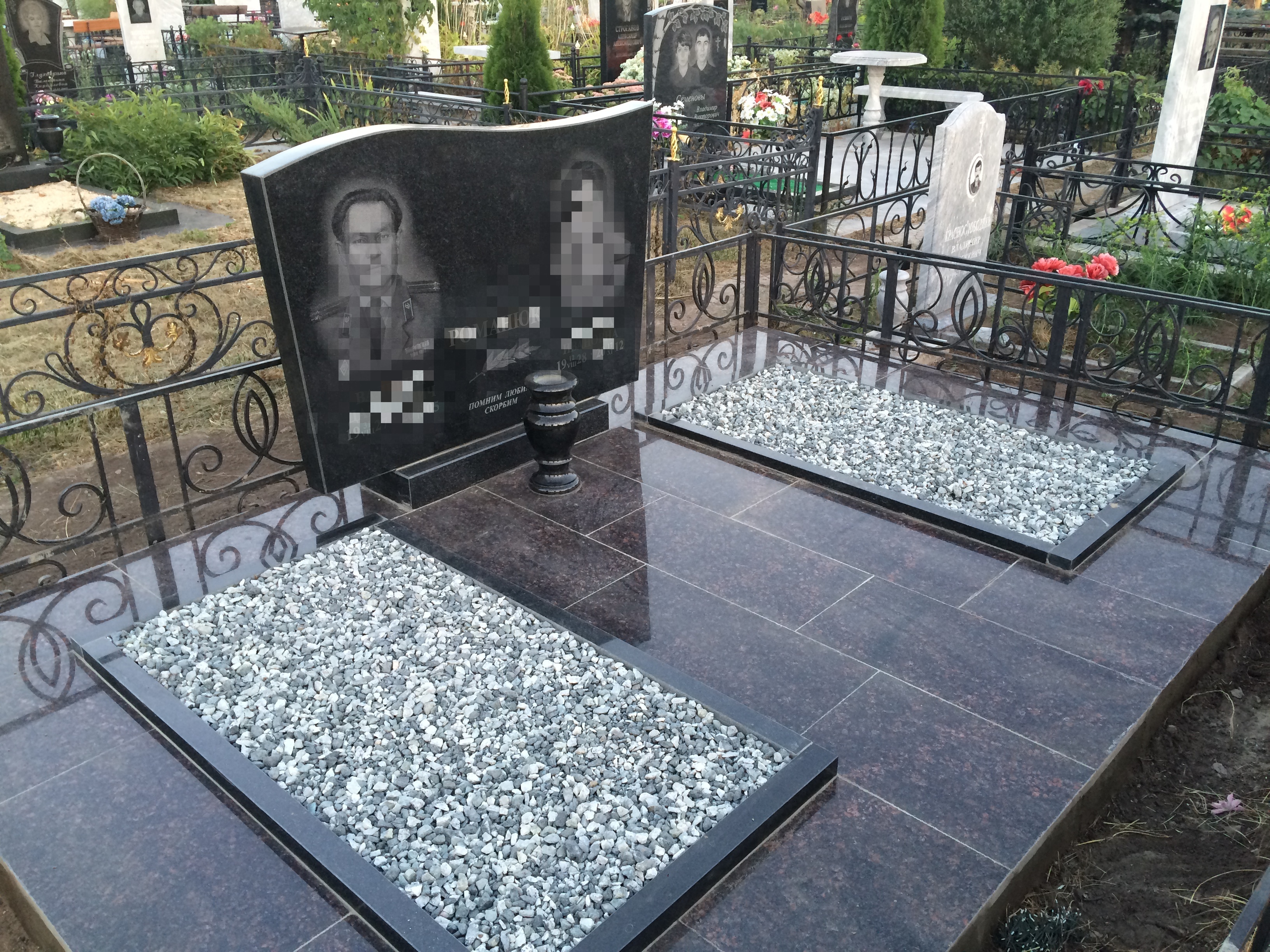 Установки памятника и цветника иногда бывает недостаточно — оформление цоколя могилы плиткой из гранита или мрамора помогает придать месту захоронения законченный аккуратный вид. Такая облицовка: